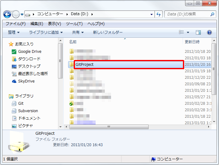 ※ここでは例として「D:\GitProject」というフォルダを作成します。