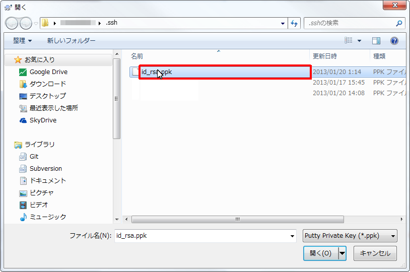 - OpenSSHの秘密鍵のファイル(拡張子無し)を選択します。