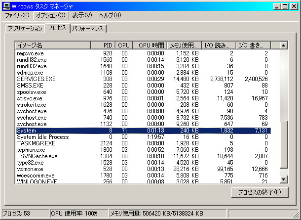 ある日、ふとタスクマネージャーのCPU使用率を見ると、なんとタスクマネージャーのSystemのCPU使用率が常に50%越えています。