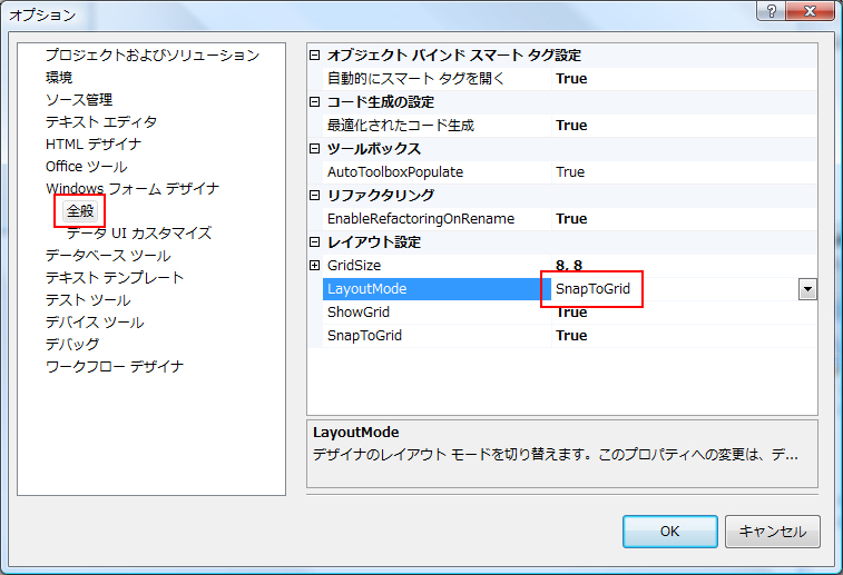 - 出てくる「オプション」ウインドウのツリーの「Windowsフォームデザイナー」→「全般」を選ぶ