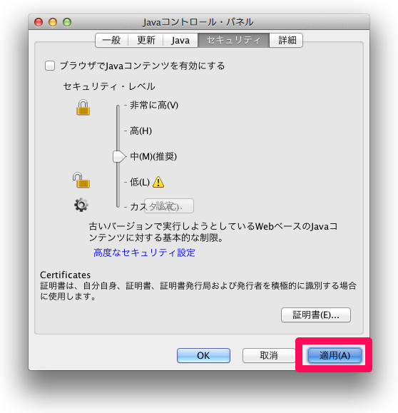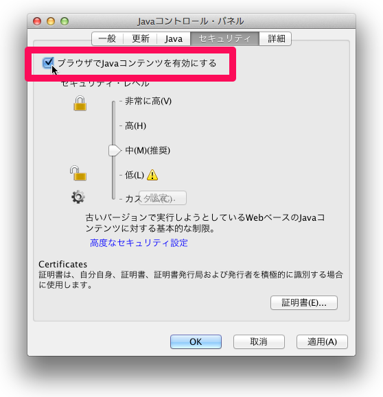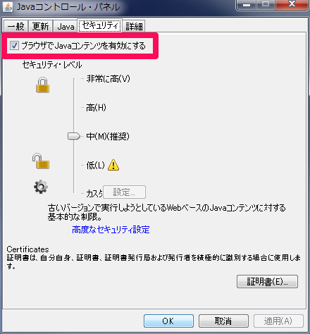 - 「ブラウザでJavaコンテンツを有効にする」チェックボックスを外します