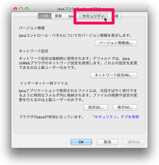 - 「Javaコントロール・パネル」ウインドウの [セキュリティ] タブをクリックします。
