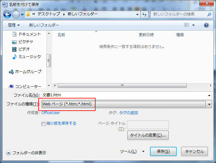- ファイルの種類を「Web ページ (*.htm;*.html)」で保存します