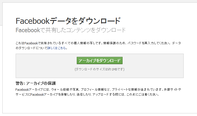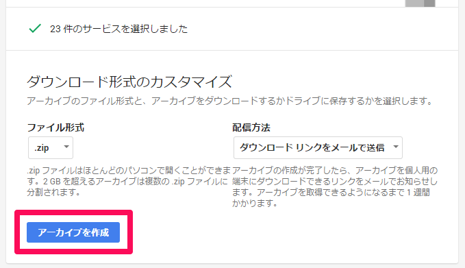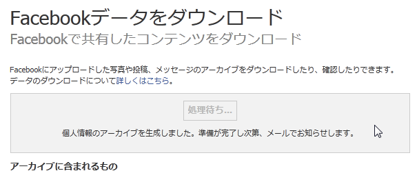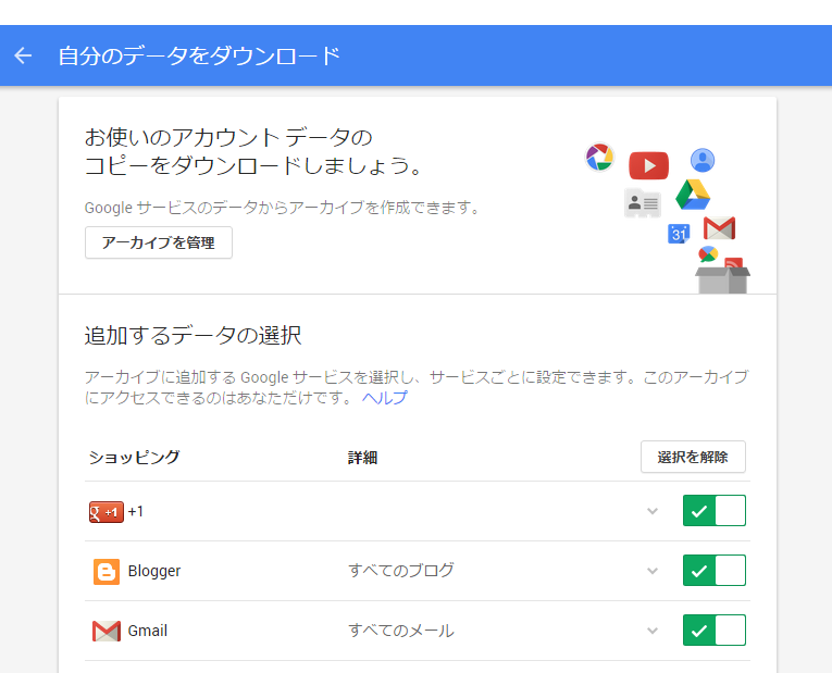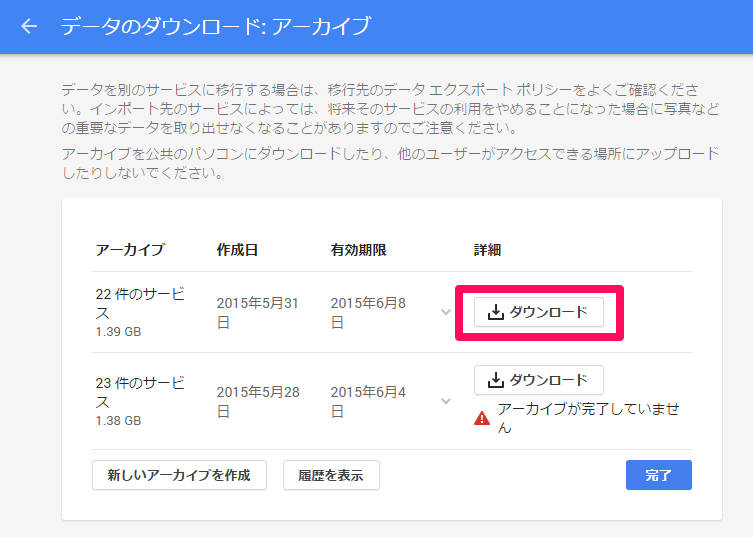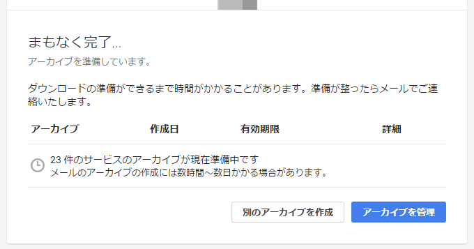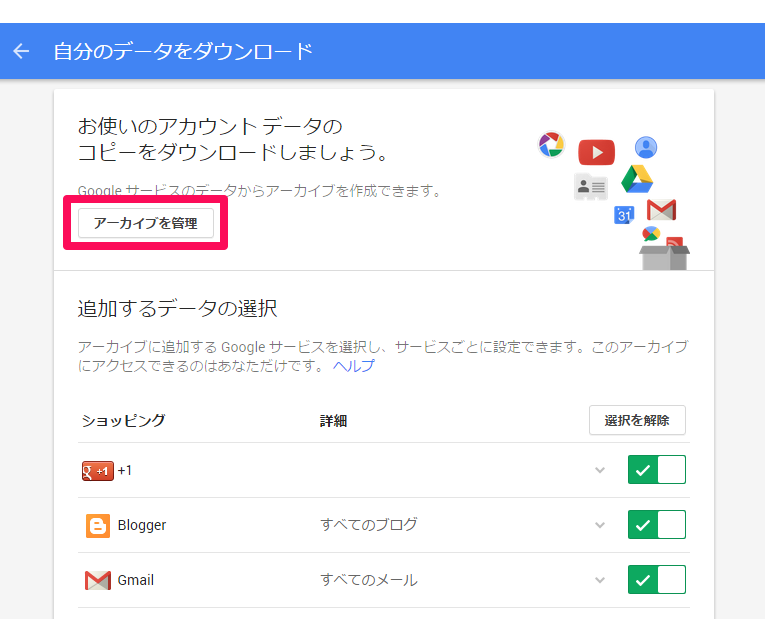 - 再度「自分のデータをダウンロード」の画面に行き、[アーカイブを管理]ボタンを選択します
