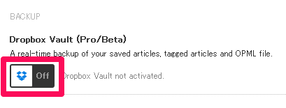 Dropboxに対して登録フィードのリスト(OPML形式)と、しおりアイコン(save for later)を選択したフィード記事(html形式、又はPDF形式)の自動バックアップを行う事が出来ます(Dropbox Vault)