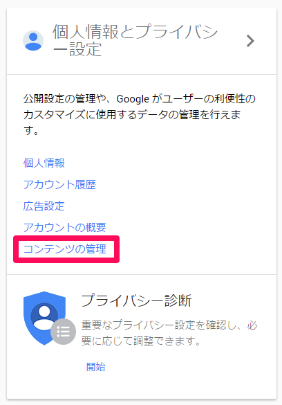- 「個人情報とプライバシー設定」項の[コンテンツの管理]を選択します。