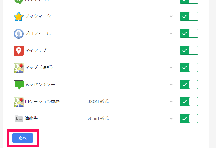 - 「追加するデータの選択」項で、エクスポートしたいサービスを選択後[次へ]ボタンを選択します。