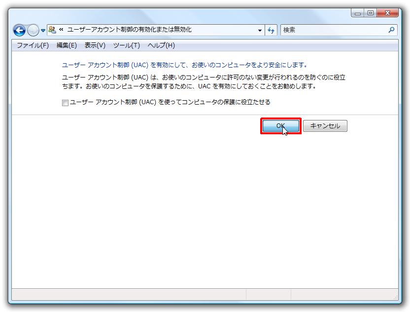 - [ユーザーアカウント制御(UAC)を使ってコンピュータの保護に役立たせる]のチェックボックスをオフ