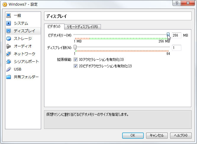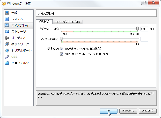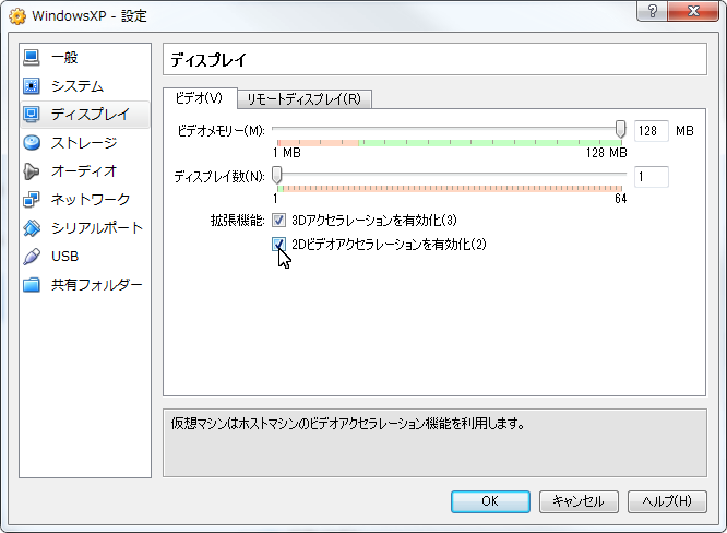 - [2Dビデオアクセラレーションを有効化] チェック ボックスをオンにします。