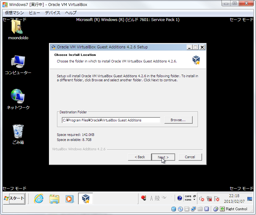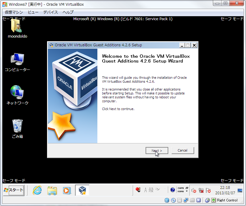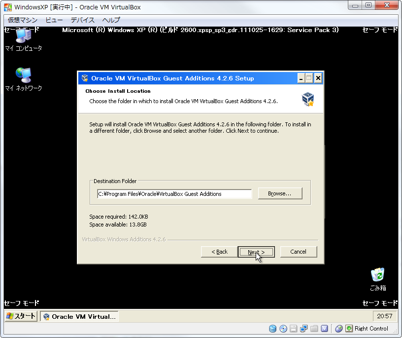 ※インストーラが起動しない場合は、マイコンピュータ→CDドライブをダブルクリックして、中にある「VBoxWindowsAdditions」(又は「VBoxWindowsAdditions.exe」)をダブルクリックして手動で起動させて下さい