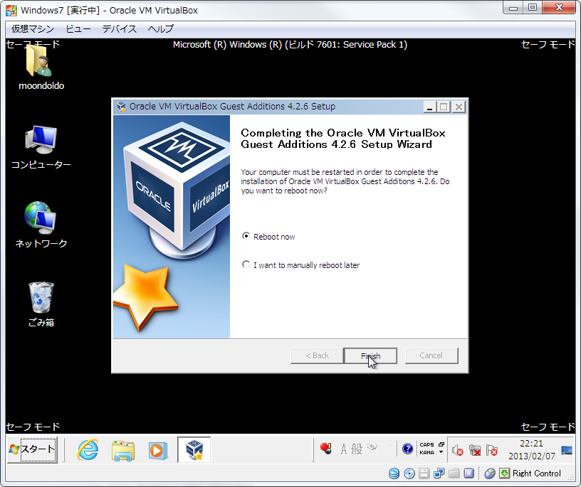- [Finish] をクリックして、仮想環境のWindows7を再起動します。