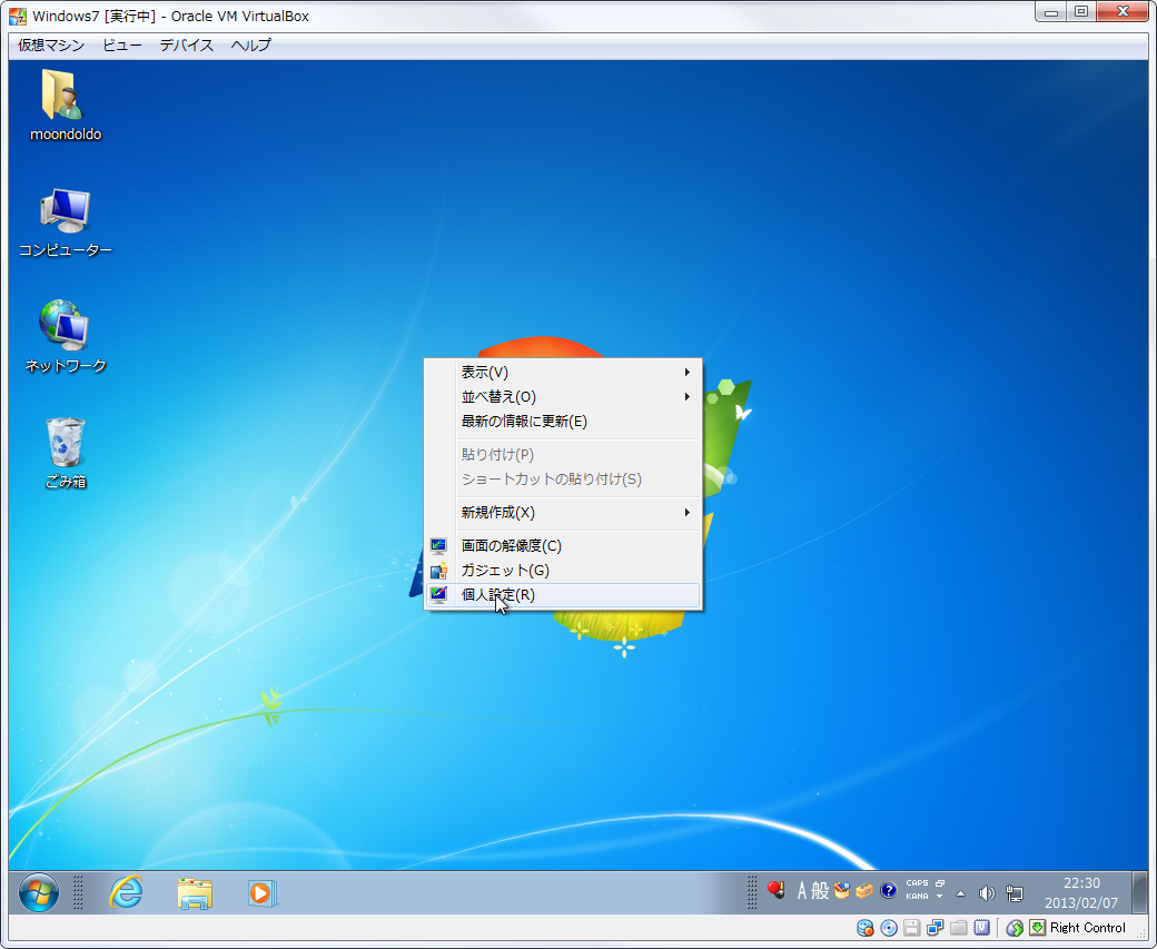 - 仮想環境のWindows7が起動したらログインして、デスクトップの何もない所を右クリックします。