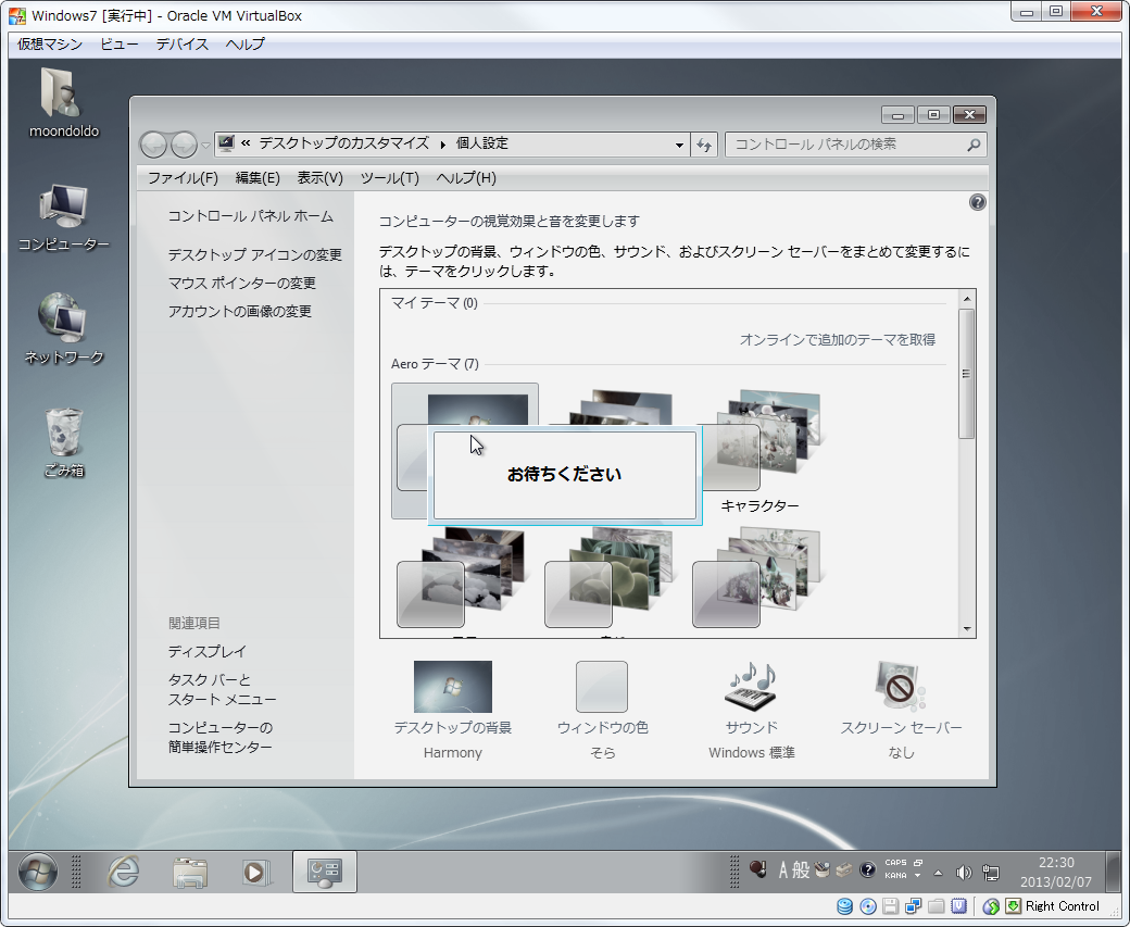 - 「個人設定」ウインドウの[Aero テーマ] の [Windows7] をクリックします。