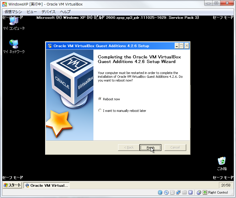 - [Finish] をクリックして、仮想環境のWindowsXPを再起動します。