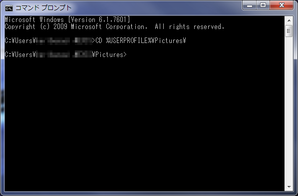 コマンドプロンプトで以下のコマンドを打ち込み、カレントディレクトリをマイピクチャーのフォルダに指定します