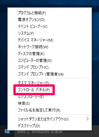 デスクトップ左下を右クリックで表示されるメニューから[コントロールパネル]を選択します。
