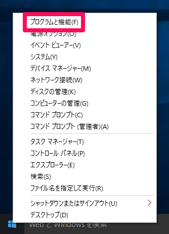 デスクトップ左下を右クリックで表示されるメニューから[プログラムと機能]を選択します。