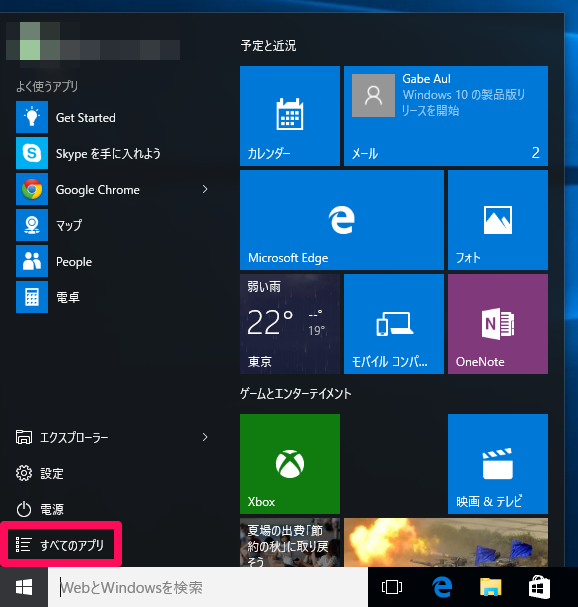 スタートメニューの「すべてのアプリ」を選択します。