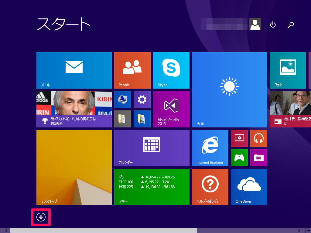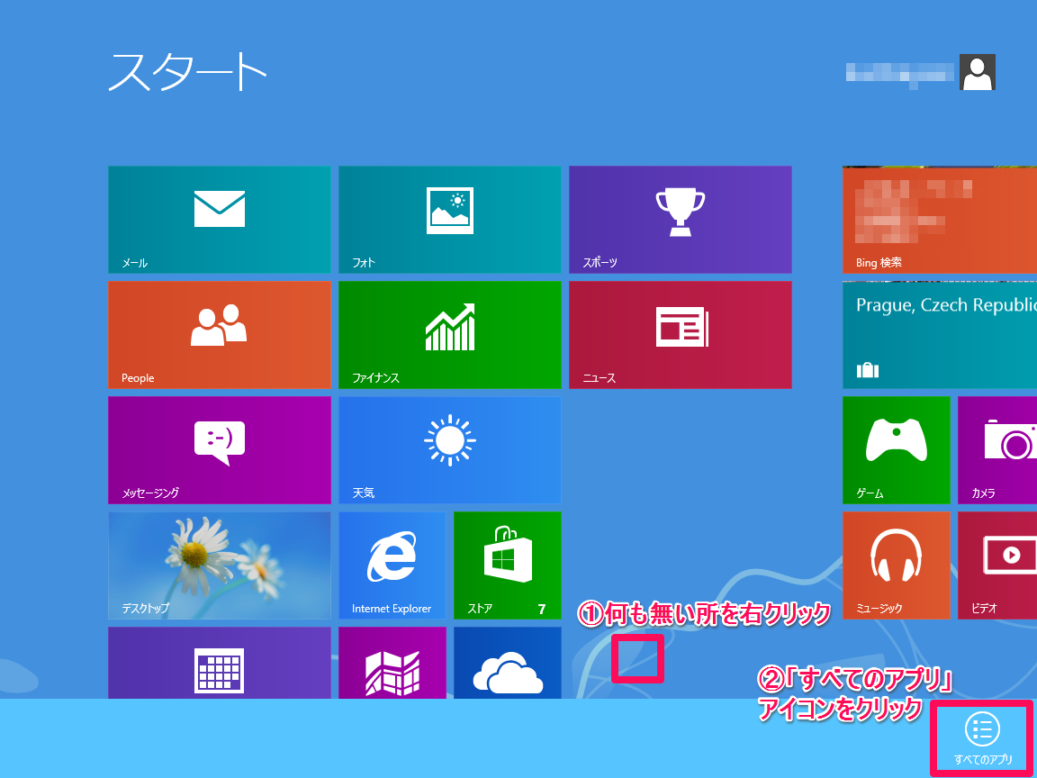 スタートメニューの何もない所を右クリックし、右下に表示された「すべてのアプリ」アイコンを選択します。