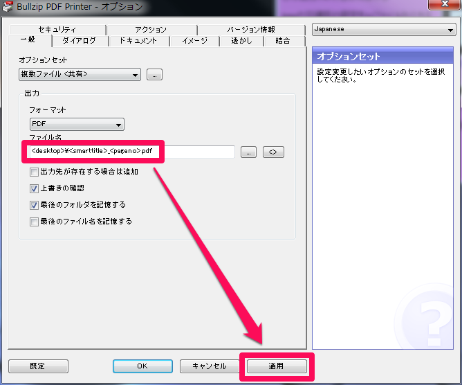 次回から、Bullzip PDF Printer へ印刷した際に出てくるダイアログの「オプションセット」を[複数ファイル]に設定すれば、1ページ1ファイルで出力される様になります