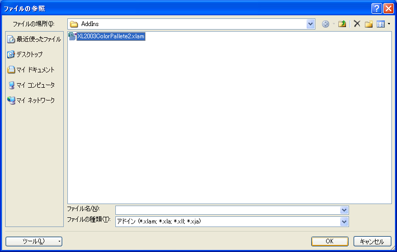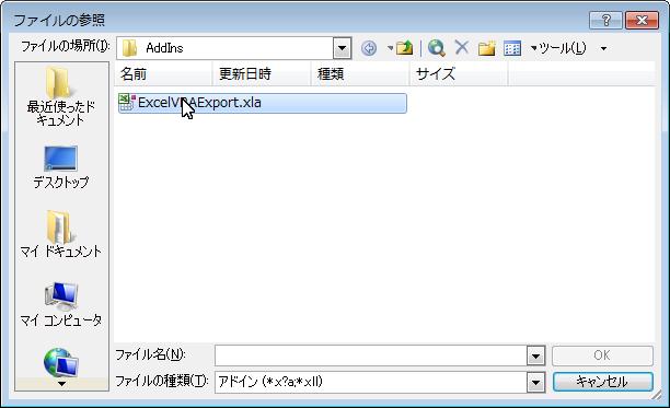 - 先ほどコピーした[ExcelVBAExport2007.xlam]を選択してOKを押す