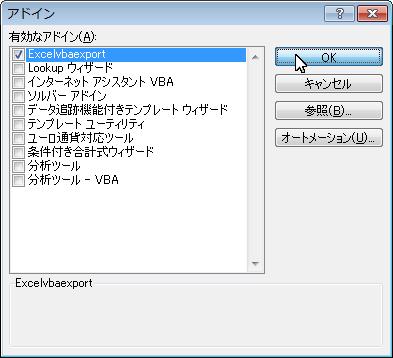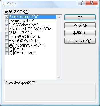 - ExcelVBAExport2007が表示され、チェックが付いている事を確認してOKを押す