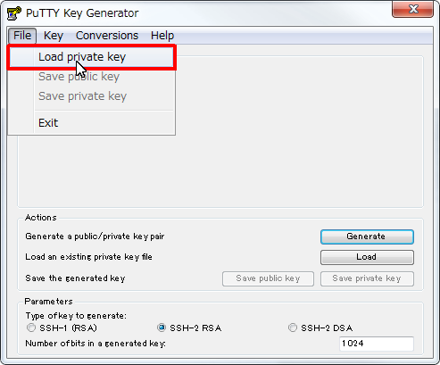 - [File] メニューの [Load private key] をクリックします。