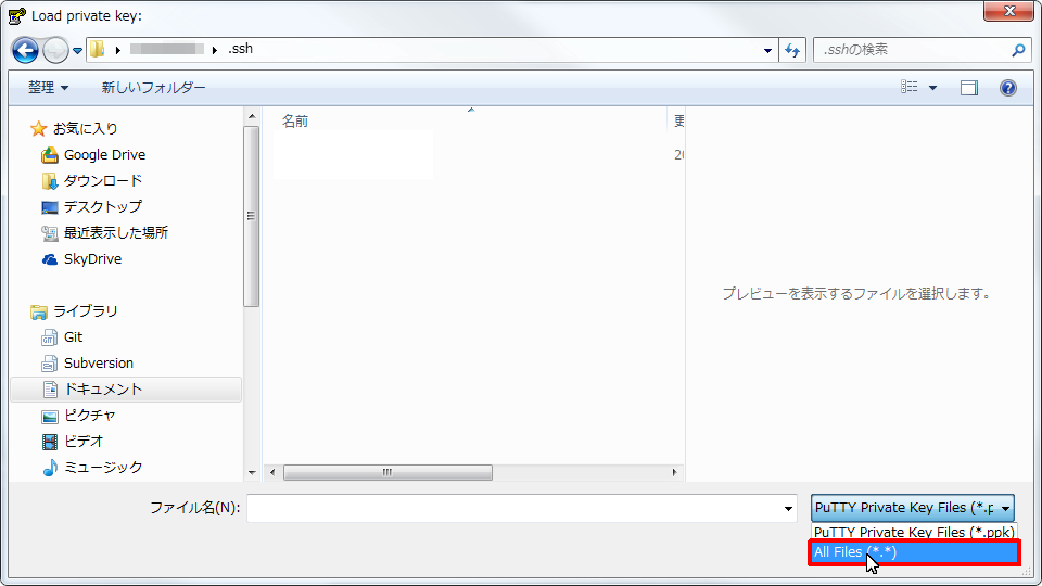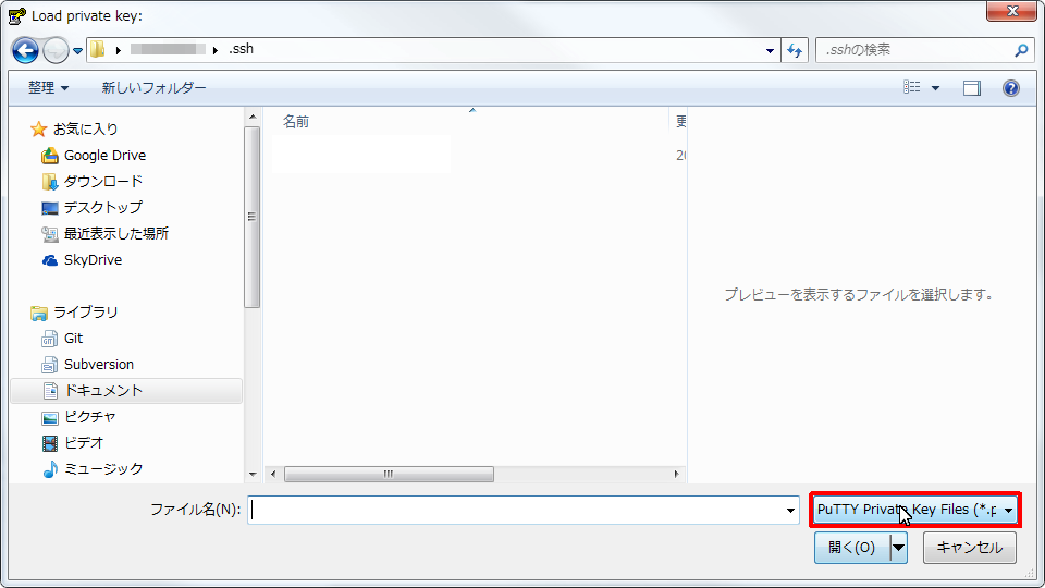 - OpenSSHの秘密鍵のファイル(拡張子無し)を選択します。