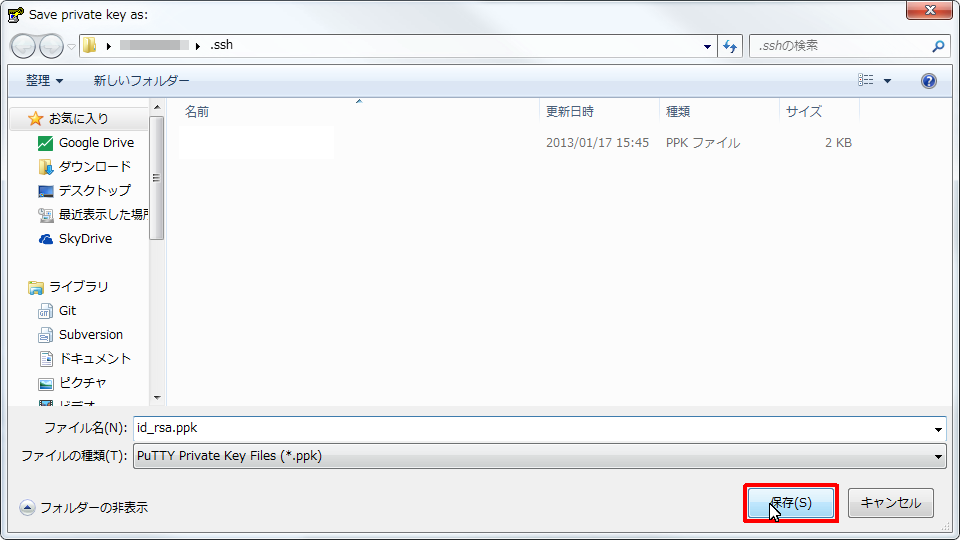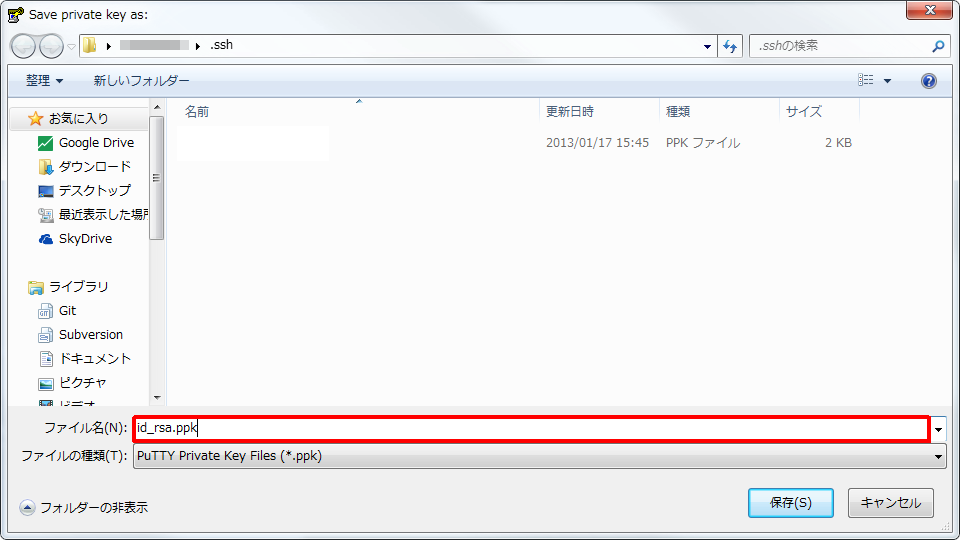 - [ファイル名] コンボ ボックスリストの [ファイル名] ボックスに 「(任意のファイル名).ppk] と入力します。