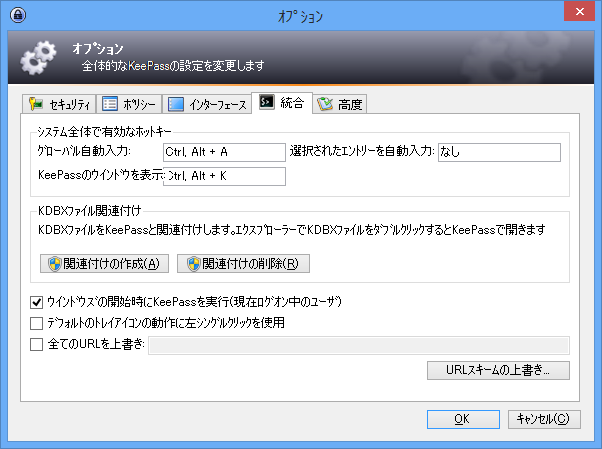- [ウインドウズの開始時にKeePassを実行(現在ログオン中のユーザ)]にチェック