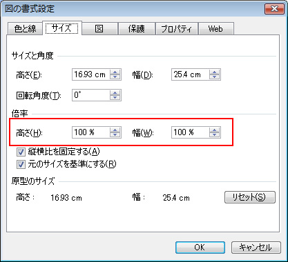 - 「サイズとプロパティ」ウインドウの[サイズ]タブの[拡大/縮小]欄の高さを100%・幅を100%にする