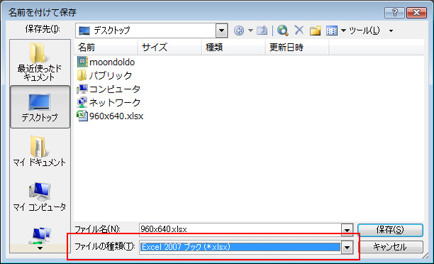 - ファイルの種類を「Excel 2007 ブック (*.xlsx)」で保存します
