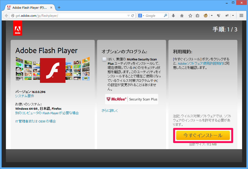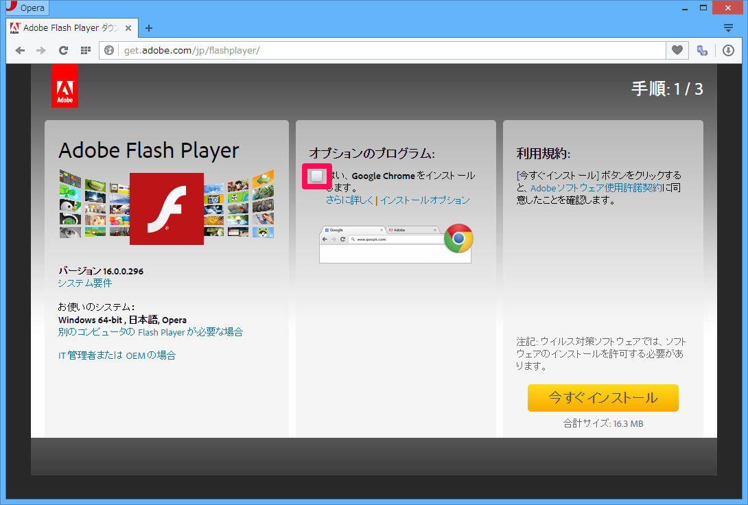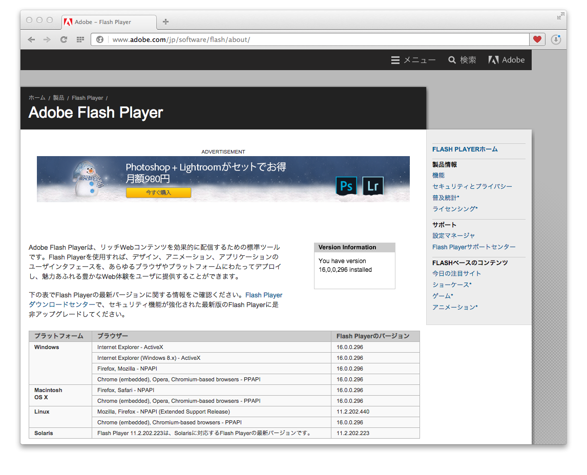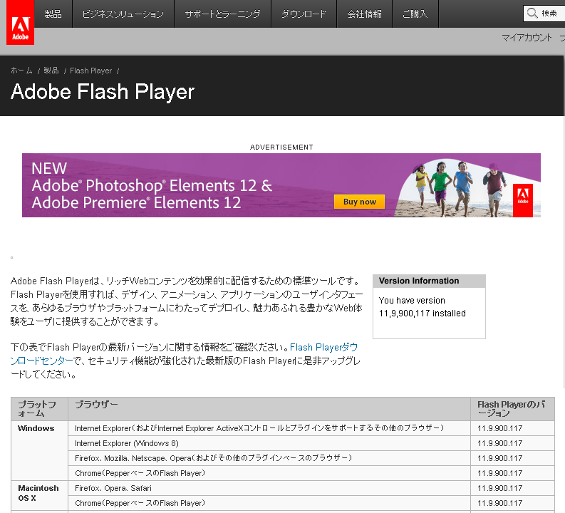 | Webブラウザ | Flash種類 | 最新バージョン (2016/6/17確認) |
