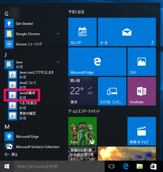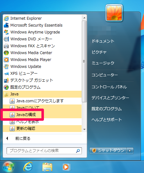 - Windowsのスタートメニューのプログラム一覧にある「Javaの構成」を選択すると、Javaコントロール・パネルが起動します