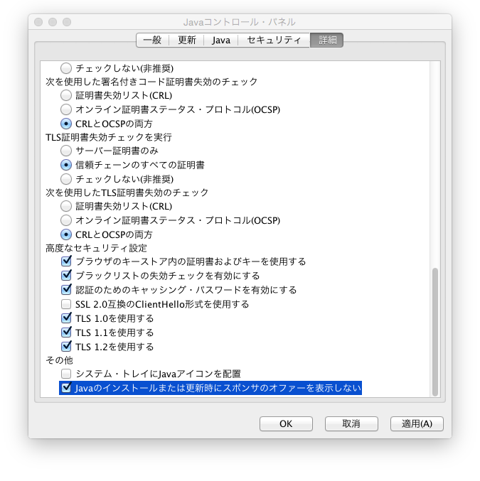 - 「その他」の項の「Javaのインストールまたは更新時にスポンサのオファーを表示しない」にチェックを押して[適用]ボタンを押します