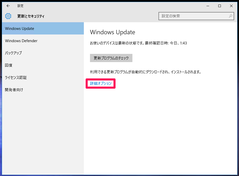 - 左側の「Windows Update」→右側の「詳細オプション」リンク