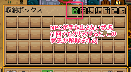 緑色アイコンになっている場合、住民(NPC)はその収納ボックスを扱えません