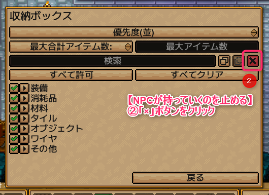 全てのアイテムを無効にすると、住民(NPC)が手持ちのアイテムを保管しなくなりますが、【勝手に中のアイテムを持って行くのを停止できません】ここ分かりづらいので注意