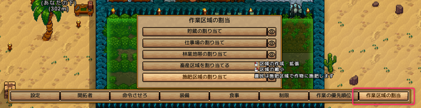 開拓地は[C]キー→「作業区域の割当」をクリックすると、青色の範囲として見る事が出来ます