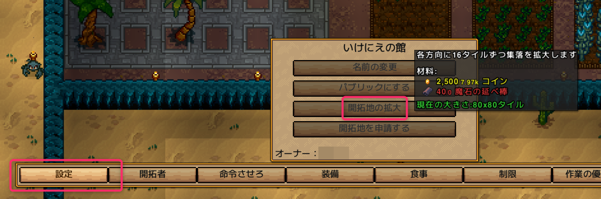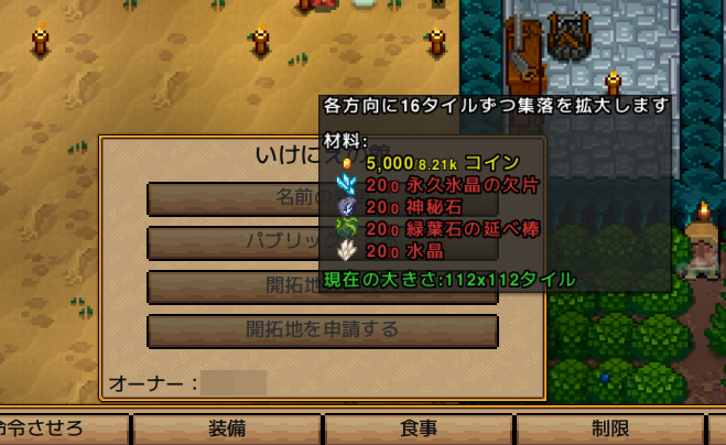 「開拓地の拡大」にマウスカーソルを近づけると、必要となる消費アイテムが表示されます