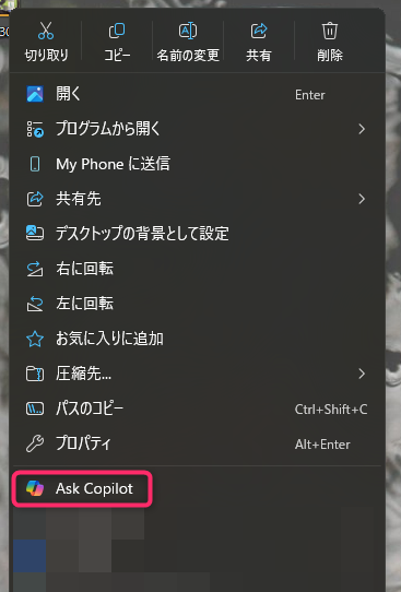 画像ファイルを右クリック時「Ask Copilot」「Copilot に質問」が出るが、一番上にあるからなのかミスクリックが頻発してすげーイライラしてた