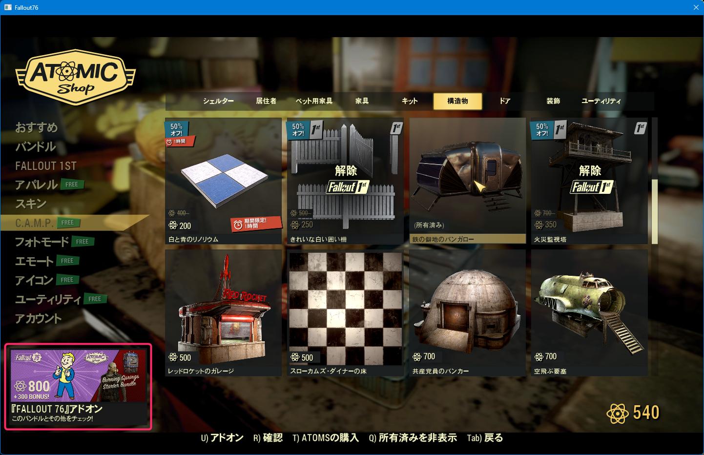 とりあえず私はAtomic Shopでこれ買った、買ったやつはC.A.M.P.のクラフトの所に出る