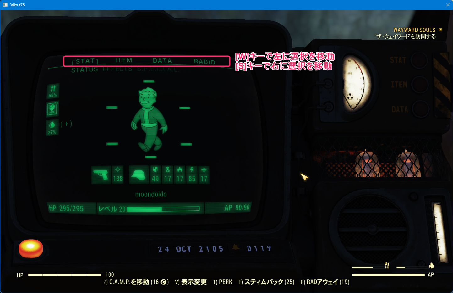 上段の大分類「STAT」「ITEM」「DATA」「RADIO」は[W][S]キーで選択を移動、又はマウスクリック