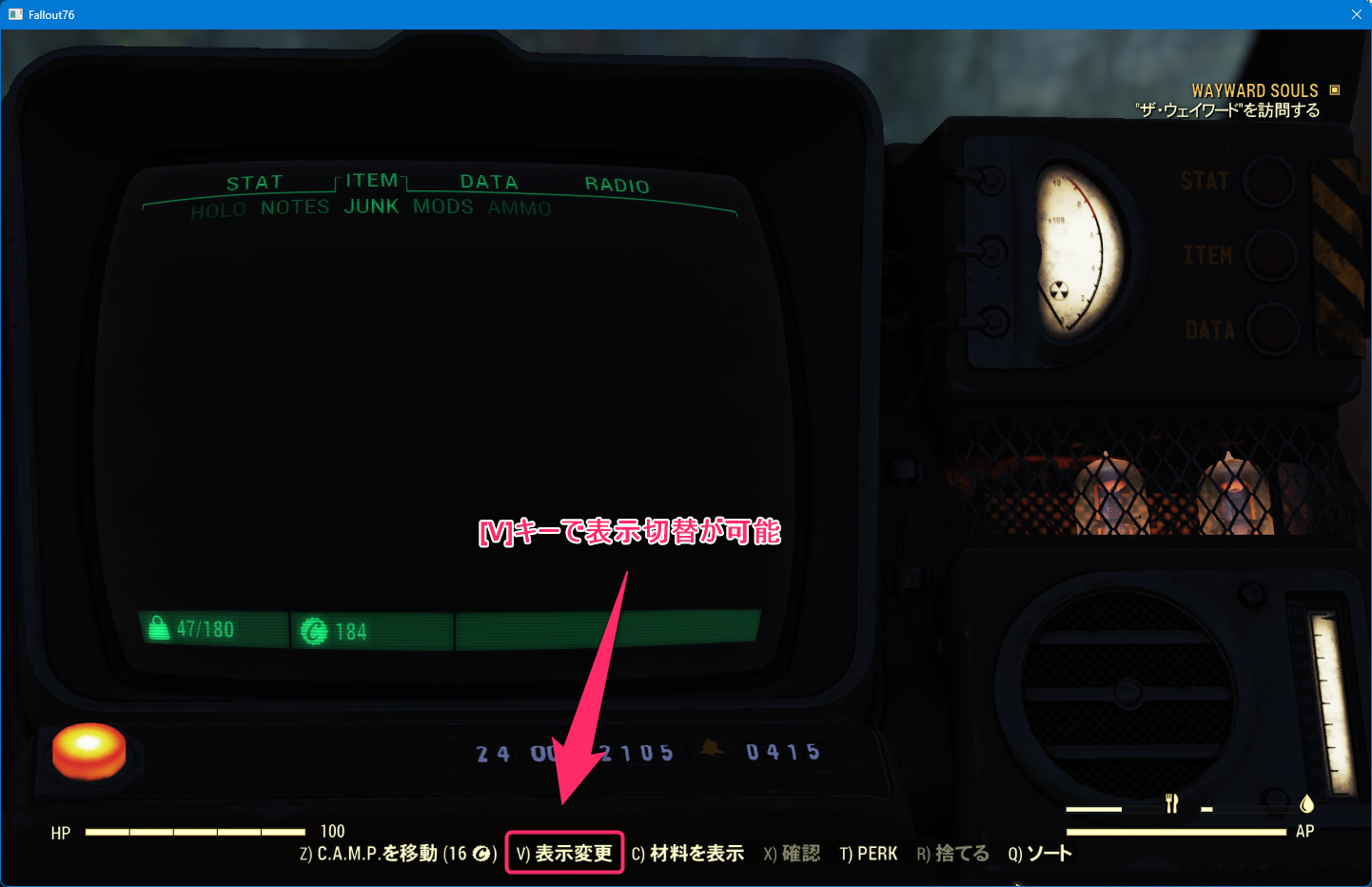 [Tab]キーで端末(Pip-Boy)を表示した後で[V]キーを押す