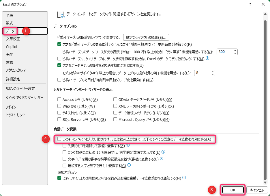 左側の「データ」→「自動データ変換」項の「Excel にテキストを入力、貼り付け、または読み込むときに、以下のすべての既定のデータ変換を有効にする」をオフ→「OK」ボタンを選択