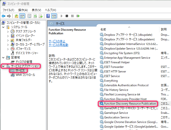 「サービスとアプリケーション」→「サービス」→「Function Discovery Resource Publication」をダブルクリック