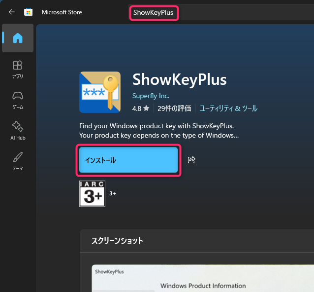 Windowsボタン→「Microsoft Store」→「ShowKeyPlus」をインストール