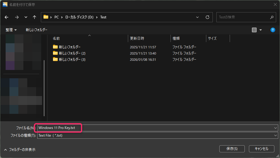 テキストファイル(Windows 11 Pro Key.txt)を印刷、PCの付属品などが入った箱に一緒に入れて保管する