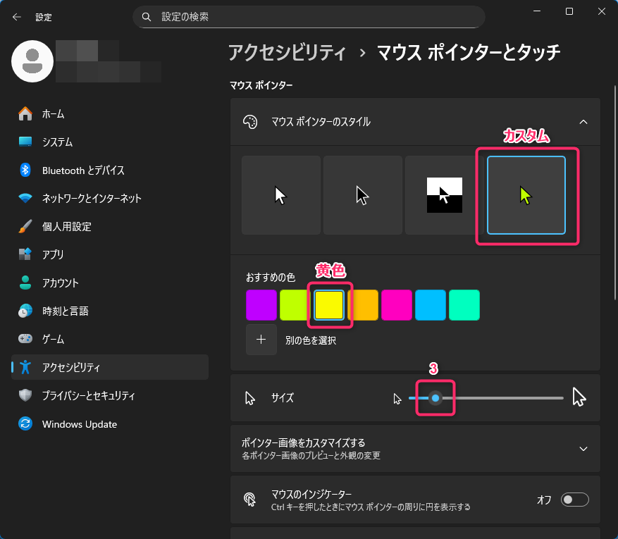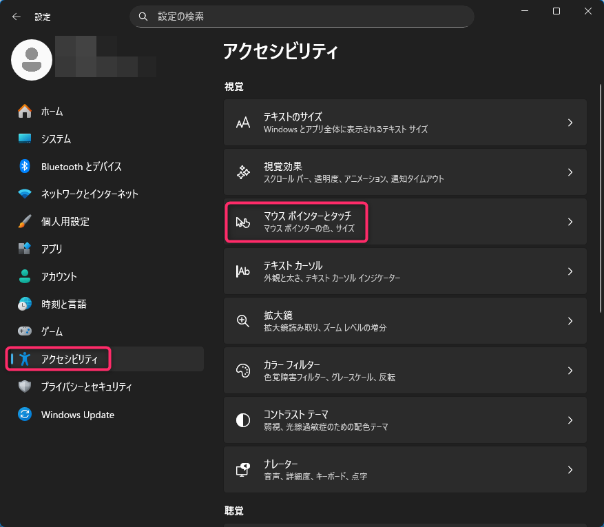 「アクセシビリティ」→「マウス ポインターとタッチ」