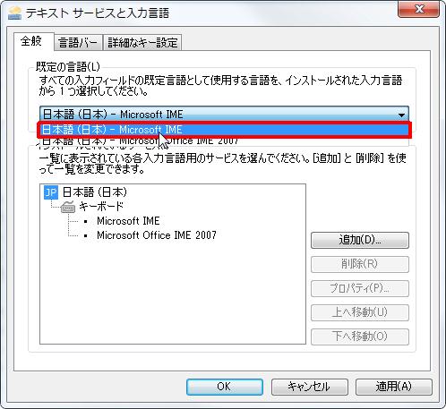 これでも直らない場合は、Office IME 2007 は使わずに Microsoft IME を使うようにします。